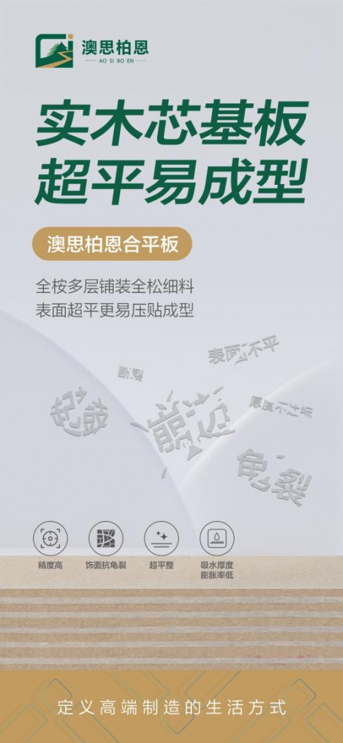 同時澳思柏恩合平板獲得了《可飾面高平整度結構板及其制備方法》《精細材料飾面加工人造板鋪裝工藝》專利技術,讓板面不止平整,更將壓貼合格率在對比傳統板材的壓貼合格率上提升了2%,貼面過程中不易出現鼓泡、鼓包等問題,再加上吸水膨脹率低,產品可適用于各類各個場景,整屋通用。真正的做到了將消費者與廠家的需求放在首位,未來澳思柏恩將持續傾聽需求不斷革新技術,為更多消費者打造綠色又舒適的家居生活環境!