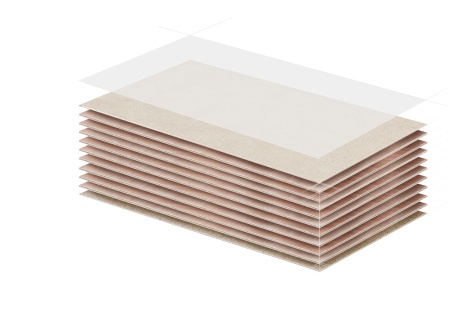 通過獨特鋪裝工藝在多層板基材上下表層鋪裝細料刨花,通過熱壓成型,板材表面超平整(板材翹曲度≤12mm,明顯優于普通膠合板≤30mm的標準要求(以18mm厚度板材為例)),板內和板間厚度公差范圍在±0.15mm,有效解決了傳統多層板厚度偏差大、平整度低、易翹曲變形的問題;表面光滑細膩,有效降低在壓貼飾面后出現的碳化、鼓泡、波浪紋等問題,提升成品合格率及成品質量。