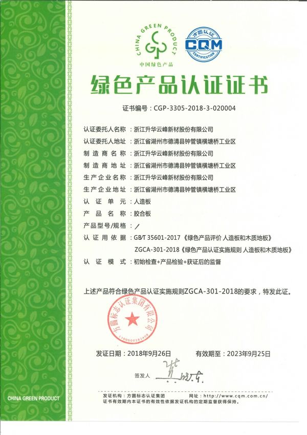2020年,莫干山板材獲得中國環境標志產品認證和“兒童安全級產品”認證。2021年11月,莫干山板材膠合板、細木工板、飾面人造板等產品以市場隨機抽樣方式獲得了由國建聯信認證中心(GJC)認定產品符合GB/T 39600—2021《人造板及其制品甲醛釋放量分級》標準而頒發的無醛人造板分級認證證書,系列產品的甲醛釋放量≤0.025mg/m3,評為ENF級,莫干山板材也成為行業首家獲得該證書的企業。2022年4月,莫干山浸漬膠膜紙飾面膠合板和細木工板符合《國家孕嬰網孕嬰產品綠色通道生產規范》和國家孕嬰網《托育與孕嬰居所環境安全防控規范》(Q/GJYY111.1-2020)的標準要求,被正式納入國家孕嬰產品綠色通道推薦目錄,同時入駐國家孕嬰網國孕商城,獲得“國家孕嬰網入網推薦證書”。