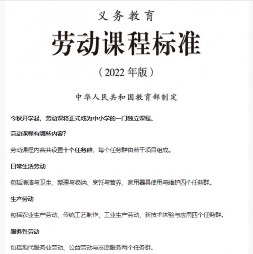 近日,教育部發(fā)布《義務(wù)教育勞動課程標準(2022年版)》。其中根據(jù)不同學(xué)段制定了“整理與收納”“家庭清潔、烹飪、家居美化等日常生活勞動”等學(xué)段目標,于2022年秋季學(xué)期開始執(zhí)行。