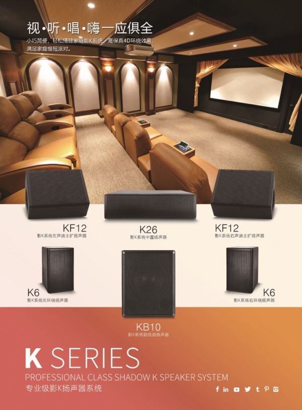 這套系統小巧簡便,是專業級的影K揚聲器系統,具有高保真4D環繞效果,一套系統滿足視、聽、唱娛樂需求。全套系統包括左聲道主擴聲器、右聲道主揚聲器、中置揚聲器、左環繞揚聲器、右環繞揚聲器。