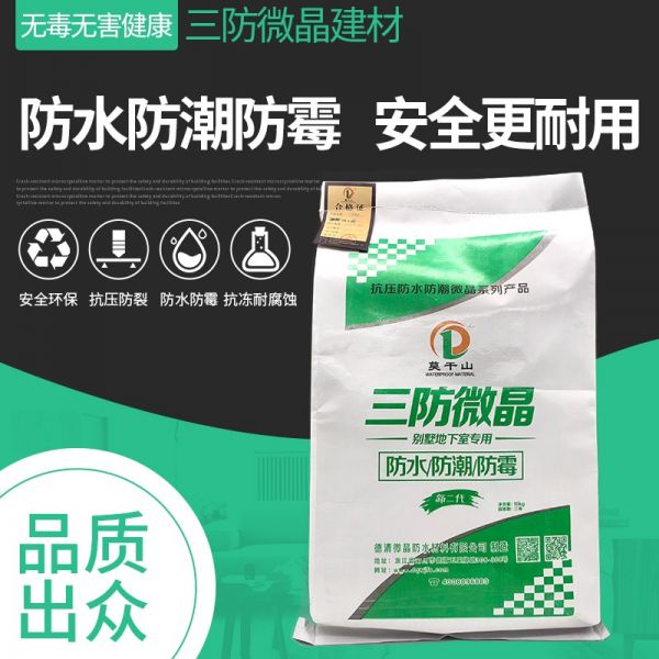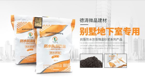 德清微晶則是一種新興的高科技防水材料。這種防水材料由公司聯合多所大學的地下建筑和工程系一起研發。這種材料能夠在水泥的水化過程中形成有自粘性和粘結性的高強度微晶體,同時排出多余的水分、封閉砂漿和混凝土內部的毛細通道和裂縫等。經過這樣的變化,水泥石和骨料就會緊密地結合在一起,與混凝土和砂漿變為一體。如果遇到潮濕或者其他水環境,德清微晶則會再次水化,使砂漿和混凝土的強度進一步得到增強。德清微晶無毒、無害、無污染,且施工過程簡單,只需要摻入水泥即可,有效期長達20年,是真正的“一次施工、一勞永逸”,有效改變了其他防水材料需要定期維護的弊端。