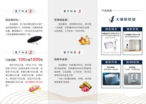 為回饋忠實消費者,此次九牧湖南技術(shù)體驗中心店開業(yè)活動,不僅有爆款、優(yōu)質(zhì)新品及保價全年的活動力度,顧客進店即享4重權(quán)益:
