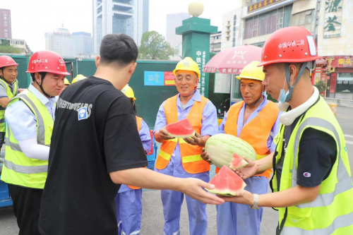 酷暑天氣,中鐵二局六公司成都軌道交通13號線小南街站正施工正酣。“每天能夠吃上項目‘清涼小車’送過來的西瓜,喝上藿香正氣液、綠豆湯、王老吉,真幸福!”結構隊伍鋼筋工老許在施工作業的間隔休息時吃著西瓜,開心地咧開嘴笑了。如今,隨著“送清涼服務隊”頻繁深入工地一線,“清涼小車”已經成為項目部各個工點作業人員翹首以盼的“心頭好”。