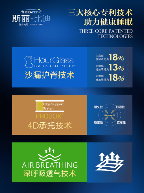 斯麗比迪擁有Hour Glass? 沙漏護脊技術 、AirBreathing深呼吸透氣技術、SuperPROBOX? 4D承托技術,三大全球核心技術和強大的睡眠研究中心所極力打造的床墊,致力為中國消費者構(gòu)筑獨有的恢復性睡眠,重新定義健康睡眠的涵意。