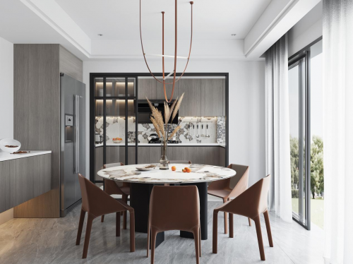 餐廳空間——灰色系的柜面與暖咖色的餐椅成為了視覺的核心色彩,流暢的金屬線條與木質(zhì)紋理共同營造出立體感,帶來不動聲色的精致,餐廳空間的細膩美感也隨之蔓延開來;冷暖材質(zhì)的對比,相互襯托,盤活了整個空間的靈韻。