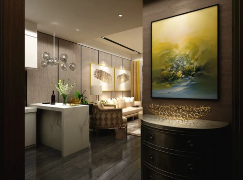 所有的直角在小空間里都會顯得格外突兀,美克美家設計師為狹窄的玄關選擇了半圓形玄關柜,令視覺舒適的同時也節約了空間。聚光燈下的裝飾畫與鏤空擺件,像被展示的藝術品,揭示了空間的格調。