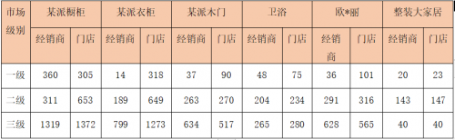 某派櫥柜三級(jí)市場經(jīng)銷商數(shù)量為1372家,占全國范圍總數(shù)量的78.6%,某派衣柜(衣柜獨(dú)立)三級(jí)市場經(jīng)銷商數(shù)量為772家,占全國衣柜獨(dú)立經(jīng)銷商總數(shù)的79.3%。索某亞門店所在城市,75%為縣城,23%為地級(jí)市,僅2%為省級(jí)城市。尚某某配2019上半年新增店鋪中,四五線城市開店占比約72%。在2020半年報(bào)中,尚某某配加盟渠道實(shí)現(xiàn)主營業(yè)務(wù)收入約16.95億元,其中三四五線城市占比約67%。