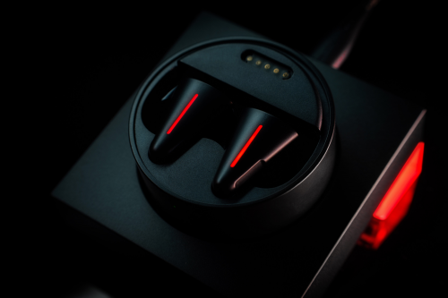 從圖片中可以看出,CYBERBLADE 黑武士版本整體采用的是更加極簡(jiǎn)風(fēng)格消光黑配色,TWS 耳機(jī)本身采用了更加凌厲獨(dú)特三角設(shè)計(jì),紅色 RGB 燈效對(duì)應(yīng)了電影中黑武士的標(biāo)志性紅色配色,也是這一設(shè)計(jì)中的點(diǎn)睛之筆。