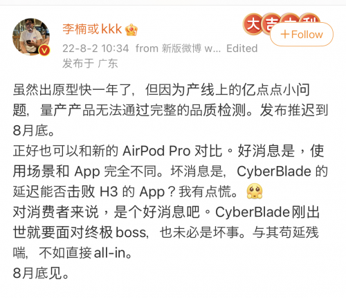 而在更早之前,李楠也多次在微博透露,宣稱(chēng)由于品質(zhì)等問(wèn)題導(dǎo)致 CYBERBLADE 發(fā)布推遲,原計(jì)劃于今年第一季度發(fā)布,如今推遲到八月底,不僅上市不久即直面九月更新的 AirPods Pro 新品,而且過(guò)度營(yíng)銷(xiāo)帶來(lái)的話(huà)題之外,當(dāng)下李楠與怒喵或許都承擔(dān)著關(guān)于 CYBERBLADE 實(shí)際發(fā)布之后用戶(hù)體驗(yàn)的壓力。