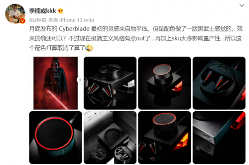 不過(guò),今天李楠也在發(fā)布微博聲稱(chēng),由于其追求的極簡(jiǎn)風(fēng)格在當(dāng)下已經(jīng)不再時(shí)尚,加上 CYBERBLADE 追求定制風(fēng)格過(guò)多,導(dǎo)致更重要的量產(chǎn)受到影響,因此這款黑武士配色版本實(shí)際上很有可能取消發(fā)布,僅作為一個(gè)概念展示。
