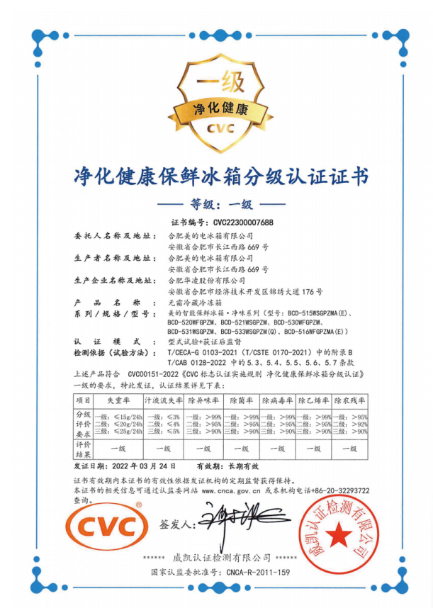 美的冰箱凈味系列,則在除菌凈味領域持續發力,硬核的凈化實力先后獲得國內知名第三方實驗室、權威檢測機構廣東省微生物分析檢測中心的的除菌凈味認證;國際權威機構SGS的多項凈化能力認證;并且通過了《CVC標志認證試試規則 凈化健康保鮮冰箱分級認證》中一級標準的要求。