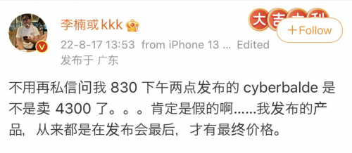 目前關(guān)于 CYBERBLADE 的價格我們還無從得知,對于先前爆料的 CYBERBLADE 定價 4300 元,李楠對此進行了辟謠,但沒有明確回應(yīng),結(jié)合此前怒喵科技多款產(chǎn)品的定價,此次 CYBERBLADE 最終仍然可能與其他怒喵產(chǎn)品一樣,有一個高昂的定價。