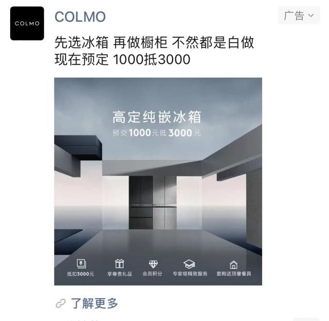 COLMO高定純嵌冰箱創新開啟了高端冰箱線上精準觸達預售模式。7月預售期在抖音、今日頭條、朋友圈多個平臺全面發力,通過多元主題口播視頻、創意廣告發布了1000元定金的購機款三倍抵扣、禮品積分、PRO專家級服務等四項預售專享權益信息,短短10天即斬獲768,281的曝光率和35,899的點擊量,實現了對目標用戶群的高效曝光和精準觸達。