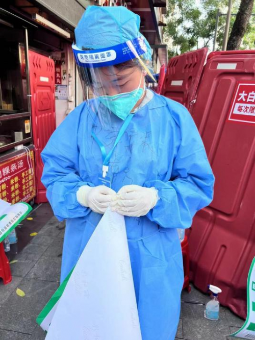 “大白”的衣服比“小藍”的更加悶熱,我們前往了居民生活區(qū),維護了指示牌,給居民遞送了需要的物資,看到居民的問題被解決,我越發(fā)感覺到我們的努力是有價值的!