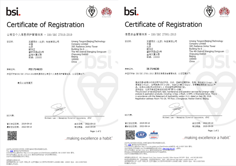 BSI是世界上首家國家級標準機構,同時也是國際標準化組織 (ISO) 創始成員之一。據了解,在本次認證過程中, BSI通過訪談員工、隨機抽查抽樣、測試等形式,對150多項涉及安全控制點和控制活動的數據安全和安全合規進行了全方位審核。最終,友盟+同時通過了ISO/IEC 27018和ISO/IEC 27001再認證,兩大認證體系可相互配合,圍繞信息安全管理和個人信息保護建立起一套科學有效的體系,為客戶提供可信可靠的數據技術服務。