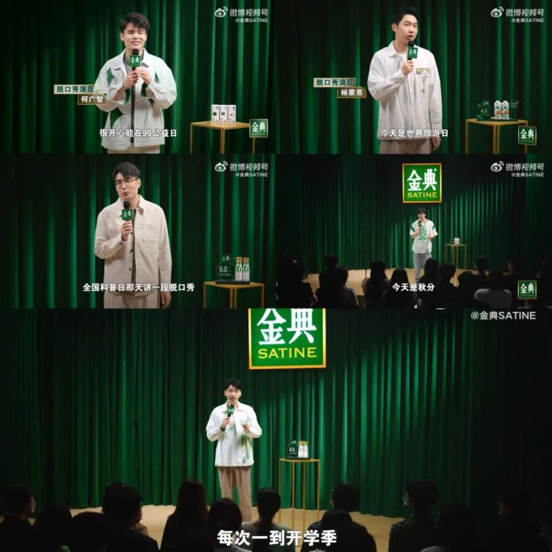 此外,金典還邀請(qǐng)龐博、周奇墨、何廣智、楊蒙恩和童漠男各講一段脫口秀,分別從表弟上學(xué)、科普、公益、旅游和秋分五個(gè)角度將金典娟姍有機(jī)奶巧妙地代入脫口秀,突出其美味、營(yíng)養(yǎng)、高科技等賣(mài)點(diǎn)