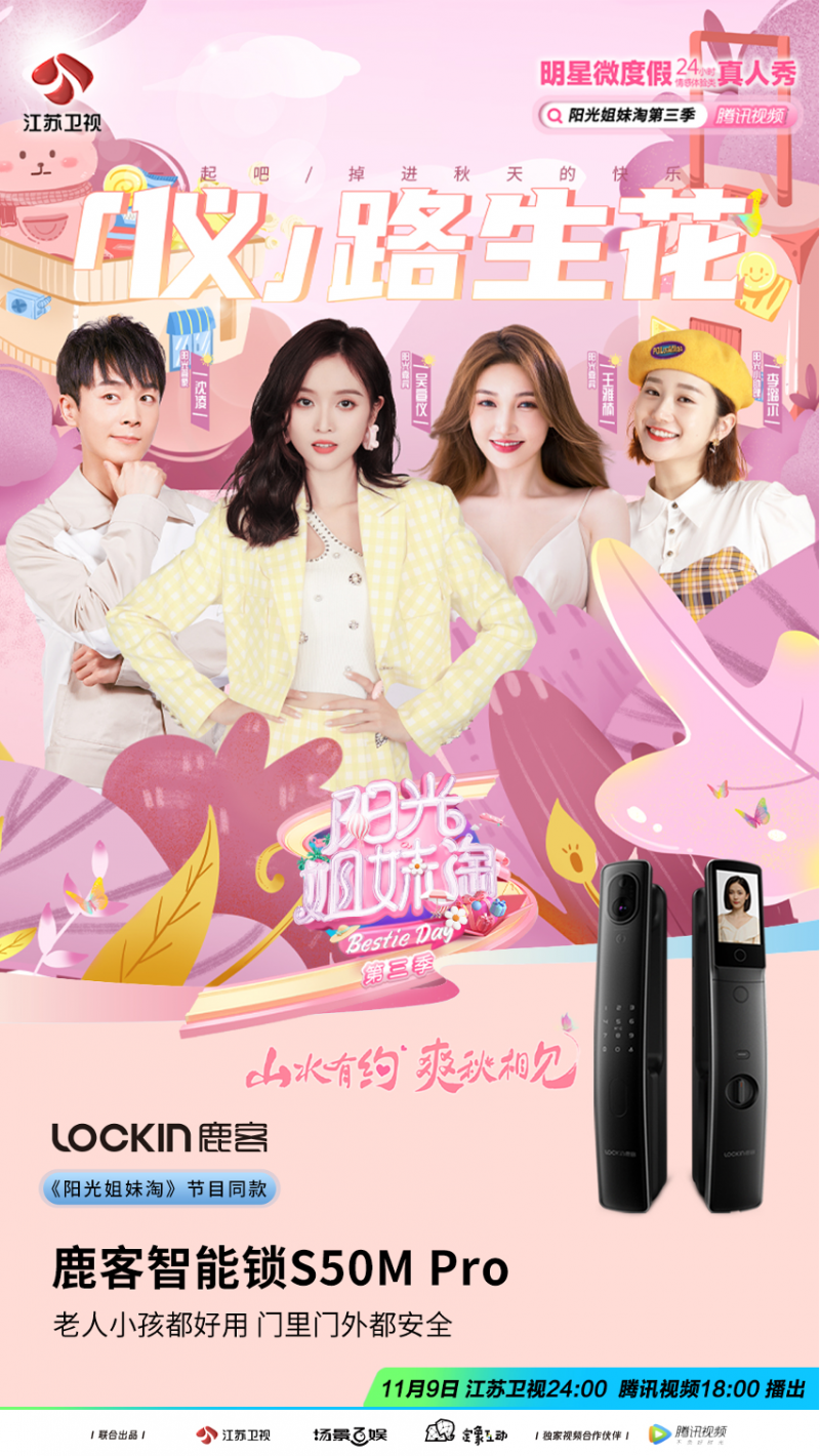 11月3日,《陽光姐妹淘》第三季第四期上線,本期節目中,吳宣儀與她的閨蜜王雅楠,陽光管家沈凌、陽光小助理李璐爾一同亮相,正式開啟爽秋篇章。而國內智能門鎖領軍者——鹿客也作為江蘇衛視《陽光姐妹淘》欄目指定產品合作伙伴,與大家一同關注女性時尚輕度假新主張,探討當代女性的“她”力量!