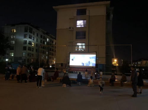 為豐富大家的精神文化生活,推動社區精神文明建設,威海萬鑫翡翠社區廣場安排了一次福利電影的放映。傍晚時分,電影放映工作人員早早掛起了幕布和活動主題橫幅,調試好設備,放起了暖場音樂。