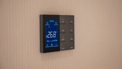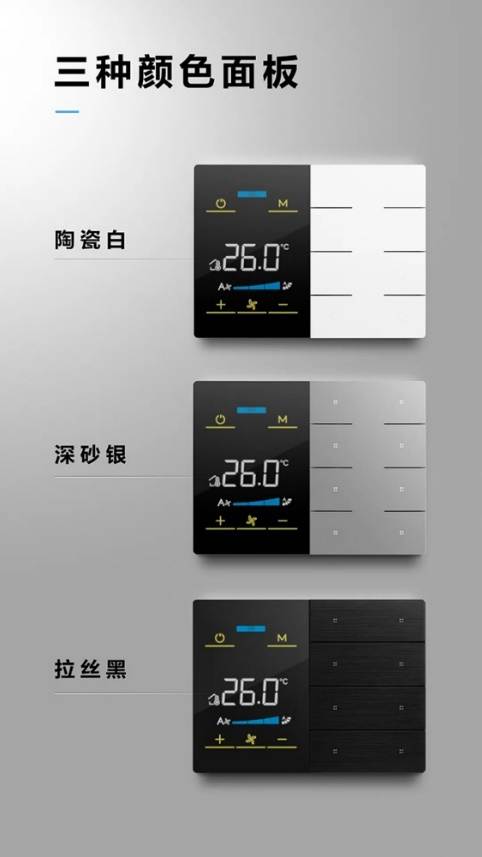 未萊KNX智能三合一溫控面板,提供空調、新風、地暖三大功能和多種模式選擇,可靈活設置接近感應功能,手勢或靠近時喚醒屏幕,方便用戶快速鎖定和使用功能,體驗更加自然流暢。