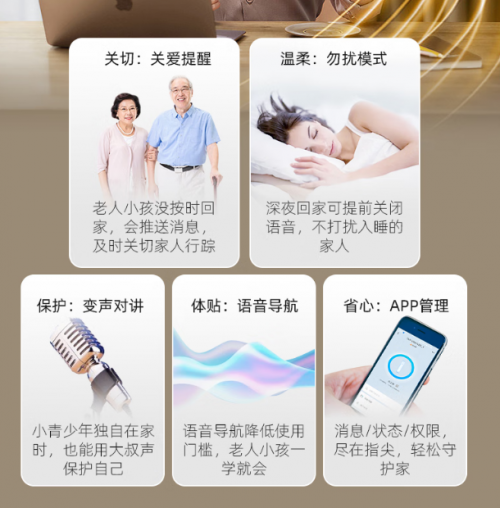 好太太品牌一直再向體驗式智能家居引領者所努力,從這款V86S的特色功能就能窺見一二。該款產品提供關愛提醒(老人小孩未按時回家)、勿擾模式(深夜回家關閉語音)、變聲保護、語音導航、APP管理共五種家庭關懷設計。尤其是變聲保護功能,小朋友或者單身女性單獨在家時,可以用大叔聲音來保護自己。