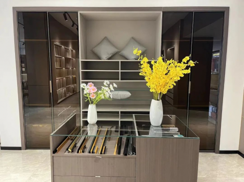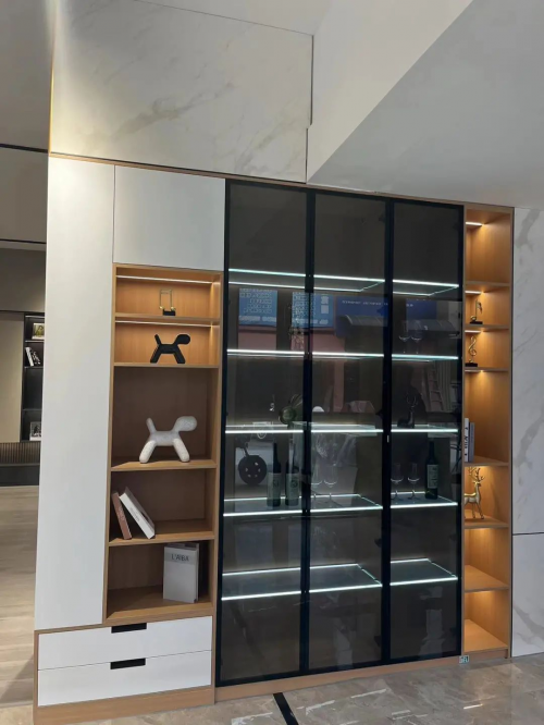 隔斷柜整體半透明設計滿足了隔斷、儲物、展示及裝飾需求,虛實結合,有曲徑通幽的意境之美。