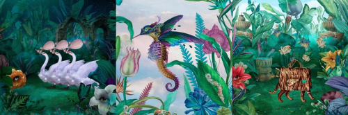 “這是一個現(xiàn)實(shí)與超現(xiàn)實(shí)交相輝映的秘境。珍奇異獸生生不息,陽光與自由伴隨著花的芬芳,綠野遍布枝莖懸浮在空中的花朵,在綻放與凋零的瞬息螺旋上升,引人入勝?!?/p>