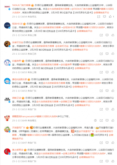 家居行業一向是環保事業的支持者,本次活動就引發了各大家居建材知名品牌強烈共鳴。作為多年的綠色公益先鋒,大自然地板此次可謂是一呼百應,以微博為主陣地,建材、五金、照明、衛浴、家紡、家電等眾多倡導綠色低碳、致力行業健康發展的家居伙伴ARROW箭牌家居、LESSO聯塑官微、土巴兔裝修APP、TATA木門官方微博、慕思寢具、詩尼曼整家定制等品牌藍v紛紛轉發活動微博,號召全網網民聚力公益事業。