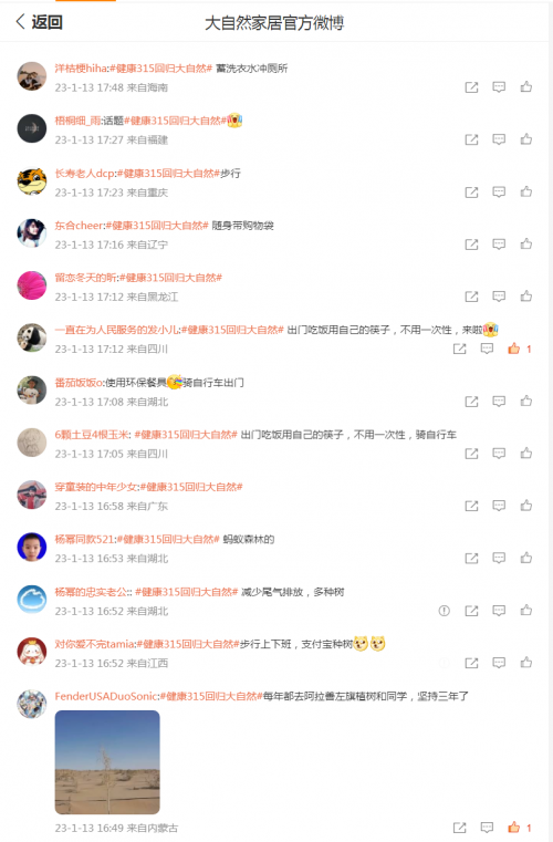 一千個人就有一千種“為大自然種顆樹”的理由,微博評論區成了網友們的“樹洞”,不同職業、身份、年齡的人一起互動,分享自己的綠色公益故事和感受。