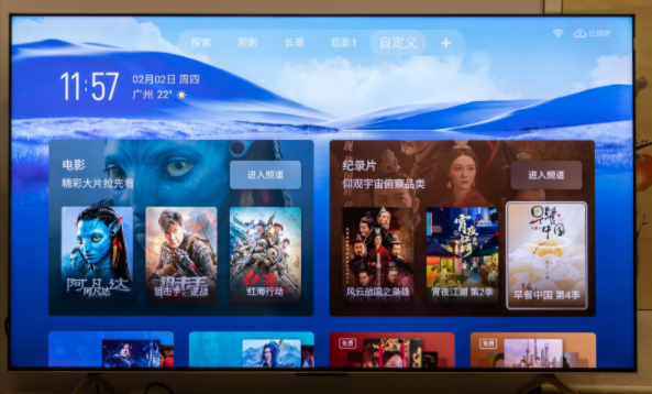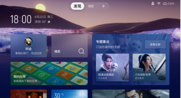 靈控桌面的驚喜不僅僅表現在開機與遙控上,它的桌面設計更是非常貼心,以往我們在電腦上看到的專屬屏幕,在電視上也可以輕松實現,還可以放置一些如天氣類的功能小組件,非常直觀也很個性化。