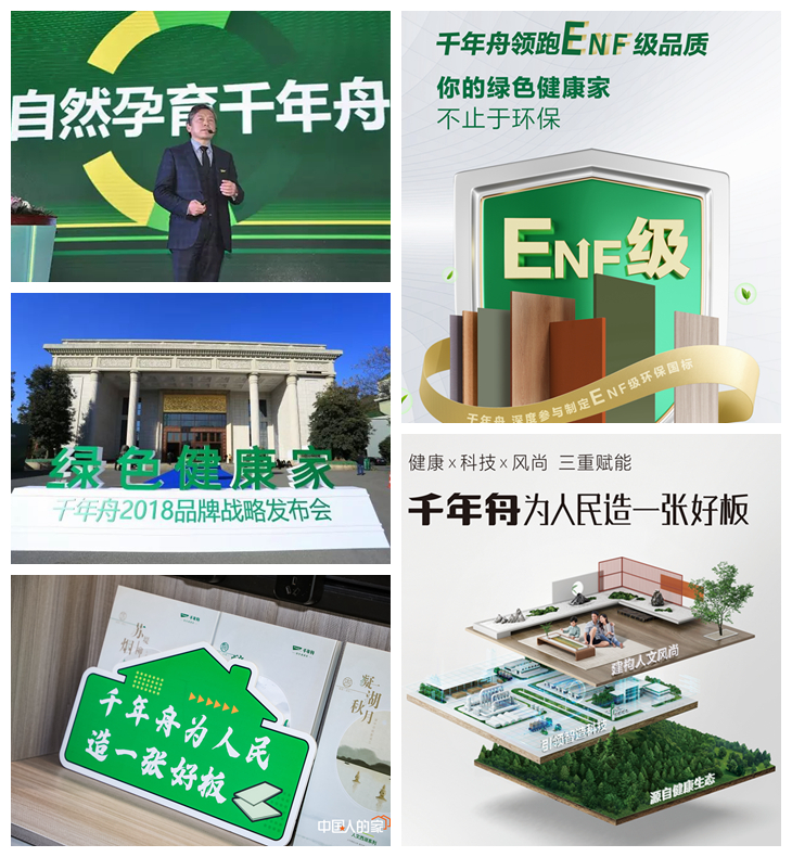 2018年之前,千年舟主打“自然孕育千年舟”,以千年舟的自然感彰顯環保品質對于美好生活的意義;2021年,推出“千年舟為人民造一張好板”,強調堅守環保與品質以客戶、用戶需求為導向;去年,則是“千年舟領跑ENF級品質” “你的綠色健康家,不止于環保”,是在新國標頒布后,千年舟把環保最高等級ENF作為基本要求,并也表達了企業和產品的無限可能。