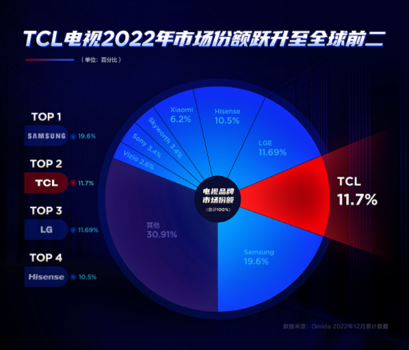 2月22日,全球權威市場調查機構Omdia發布了2022年全球電視市場出貨量報告,數據顯示TCL電視2022年全年銷量市占率提升0.2個百分點至11.7%,超越韓國電視品牌LG,躍升至全球第二;市占率自2019年穩步提升,提升幅度達到了28%。