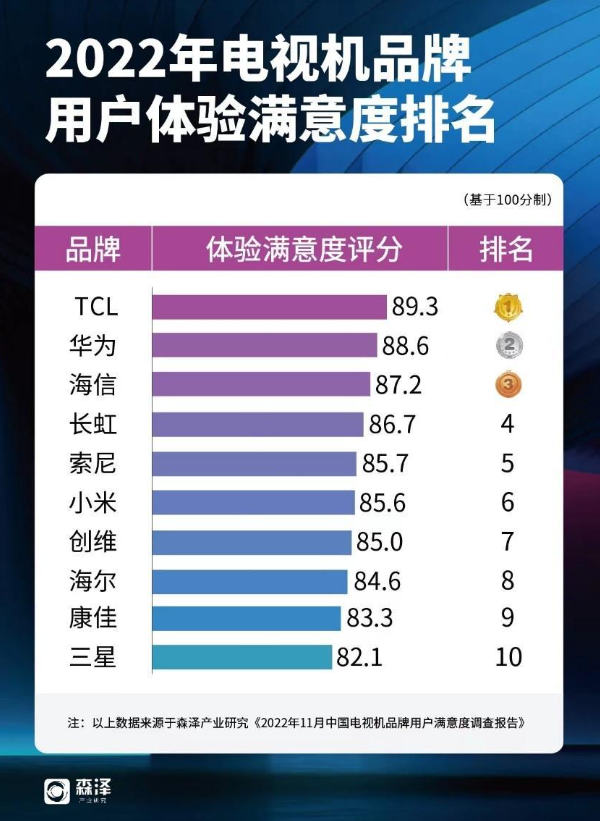國內知名產業調研機構森澤《2022年中國電視品牌用戶滿意度調查報告》種顯示,14.8%的用戶對TCL好感度最高,在用戶好感度排名第一。在消費者整體滿意度評價TCL得分為89.3分,排名第一。TCL品牌的復購率為81.0%、用戶凈推薦值達到為50.7%,同樣位列第一。用科技為產品賦能、用畫質滿足用戶,是TCL收獲市場銷量與用戶口碑的關鍵因素。