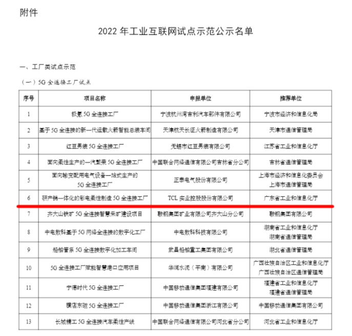日前,中國工業(yè)部和信息化部公示了2022年工業(yè)互聯(lián)網(wǎng)試點示范名單,TCL實業(yè)以“研產(chǎn)銷一體化的彩電柔性制造5G全連接工廠”項目建設(shè)成功入選國家“5G全連接工廠”,全國全行業(yè)僅33家獲此殊榮,全國智能家電行業(yè)更是只此一家。