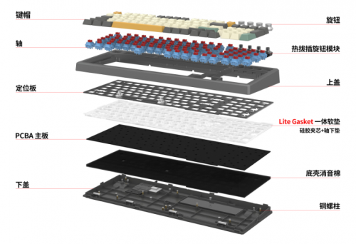 其實(shí)GASKET(軟彈)結(jié)構(gòu)早先是由國外客制化團(tuán)隊提出的,他們通過墊圈軟連接固定,使得鍵盤整體手感和按壓表現(xiàn)軟、彈的同時,還能有效降低空腔雜音;但它的結(jié)構(gòu)穩(wěn)定性較弱,而小呆蟲的開發(fā)團(tuán)隊對該結(jié)構(gòu)進(jìn)行了調(diào)整、改進(jìn),變?yōu)?輕彈 Gakset,它既有墊圈的這種軟連接的好處,有消音和抑制共振的能力,又有硬連接的結(jié)構(gòu),保持它的穩(wěn)定,輕彈 Gasket相關(guān)產(chǎn)品推出后迅速得到了市場的認(rèn)可,充分體現(xiàn)了SKYLOONG小呆蟲對客制化市場需求、技術(shù)方向的準(zhǔn)確判斷。