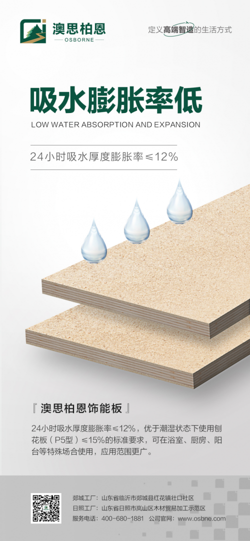 澳思柏恩飾能板24小時吸水厚度膨脹率≤12%,優于潮濕狀態下使用刨花板(P5型)≤15%的標準要求,可在浴室、廚房、陽臺等特殊場合使用,應用范圍更廣。