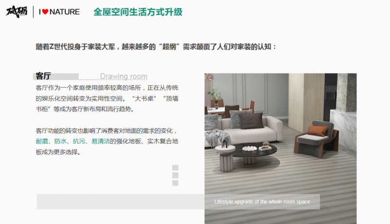 隨后,《2019粵港澳大灣區(qū)住宅精裝交付標準白皮書》主編、想象數(shù)科合伙人李可欣女士現(xiàn)場發(fā)布《2023綠色家居消費趨勢白皮書》。白皮書中指出:隨著消費者全空間的生活方式升級,全屋通鋪木地板成為潮流趨勢,重塑新時代家居空間。