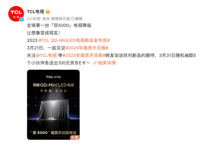 根據(jù)預(yù)熱海報(bào)來(lái)看,被稱為2023年畫質(zhì)天花板、全球第一臺(tái)「雙5000」電視為TCL X11G領(lǐng)曜QD-Mini LED電視,主打【不灼屏 更絢麗】,而「雙5000」指的則是5184個(gè)背光分區(qū)與5000nits的峰值亮度,考慮到當(dāng)前電視行業(yè)背光分區(qū)與峰值亮度數(shù)值最高區(qū)間為2000-2500,TCL X11G電視將全面刷新行業(yè)紀(jì)錄,這點(diǎn)上確實(shí)有種“王者降臨”的感覺(jué)。
