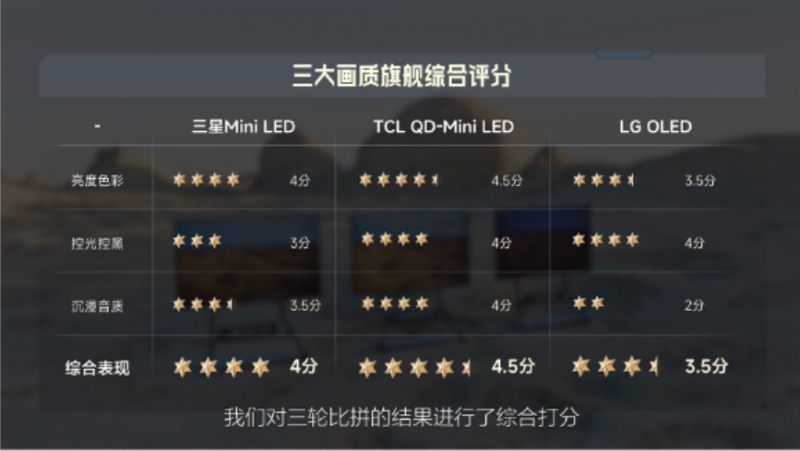 從整體的對比表現(xiàn)中我們可以發(fā)現(xiàn),TCL X11G憑借其「雙5000」的高畫質(zhì)配置,在畫質(zhì)方面有著相當(dāng)不俗的表現(xiàn),即使是面對OLED這種黑場表現(xiàn)具有優(yōu)勢的電視,也同樣能和它打得有來有回,而亮度方面的表現(xiàn)就更是無人能及了。