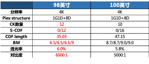 (98吋與100吋屏幕具體參數)