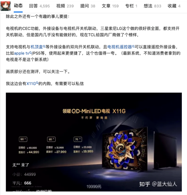 之前裝修的時(shí)候因?yàn)橥队皟x很火,沒買電視,但用下來發(fā)現(xiàn)投影畫質(zhì)是真不行,尤其是白天,還是得搞臺(tái)好電視。最近在網(wǎng)上發(fā)現(xiàn)不少家電大V和行業(yè)大佬都在推薦TCL新出的X11G,看完他們的專業(yè)測(cè)評(píng),對(duì)比了下其他產(chǎn)品評(píng)測(cè),我也確實(shí)覺得X11G夠頂,那就選他了~