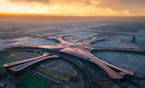 北京大興機場——新世界七大奇跡榜首。頂部橙色設計源自“浴火鳳凰”的設計理念,采用暖橙歡樂活潑的光輝色彩,以火焰般熾熱溫暖的顏色描繪光輝與幸福之感,與首都城市精神完美契合。