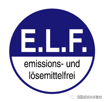 為德語Emissionsminimiert(排放最小化),L?semittelfrei(無溶劑),Weichmacherfrei(不含增塑劑)的縮寫,是德國水性涂料高環保要求的標志。E.L.F.的標準要求VOC最大限量為1g/L,不低于藍天使的要求。(E. L.F.的標準要求VOC最大限量為1g/L < 中國國標VOC最大限量為100g/L)。