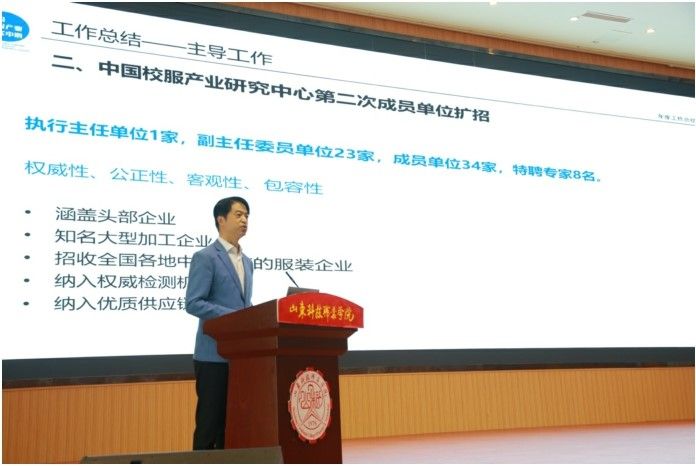 4 月 19 日,由中國服裝協會主辦,中國校服產業研究中心(以下簡稱“研究中心”)、山東科技職業學院承辦、濰坊尚德服飾有限公司支持的 2023 中國校服產業研究中心年會在山東省濰坊市山東科技職業學院召開。中國服裝協會常務副會長、研究中心主任楊金純,中國服裝協會副秘書長杜巖冰,山東省教育發展服務中心黨委書記魏光祥及研究中心成員企業代表 100 余人參加了本次年會。山東科技職業學院黨委書記鄭德前為大會作開幕致辭。