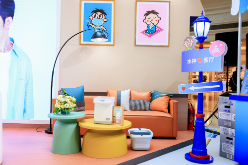 契合發布會主題,旺旺水神現場模擬家居環境,以新品水神HD-4L消毒機為中心,連接客廳、臥室、廚房、餐廳、衛浴等日常環境,用水神替代自來水使用,演示客廳地面清潔、臥室家紡打理、廚房蔬果清洗、衛浴系統除味、全屋降甲醛等,全場景展現水神HD-4L消毒機的家庭應用場景。