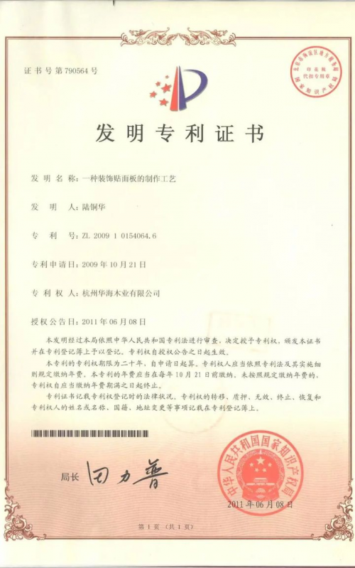 近年來,作為行業科創引領單位之一,千年舟多次在科創領域取得碩果。2021年10月2日頒布的GB/T 39600—2021《人造板及其制品甲醛釋放量分級》也有千年舟的身影,2023年4月17日,由國家知識產權局頒布的《第二十四屆中國專利獎評審結果公示》中,千年舟集團董事長陸銅華發明的《一種裝飾貼面板的制作工藝》專利榜上有名,摘得“中國專利優秀獎”。