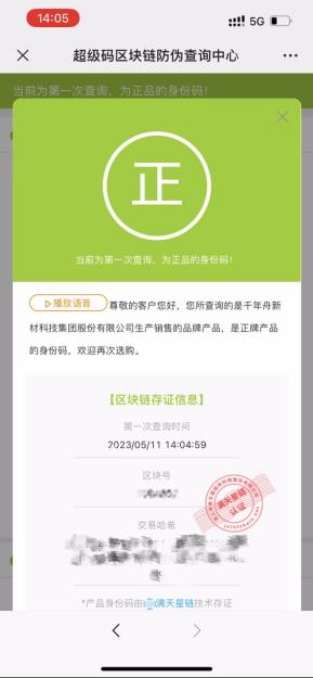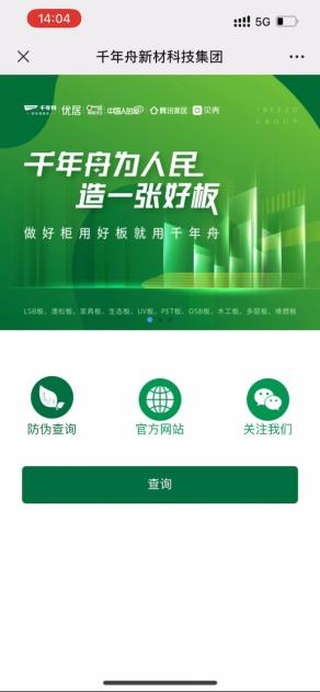 關注千年舟Treezo微信公眾號,在手機下方菜單欄選擇“在線服務”→ “防偽查詢”;關注千年舟微信公眾號或千年舟集團微信公眾號,在手機下方菜單欄選擇“舟到服務”→ “防偽查詢”。