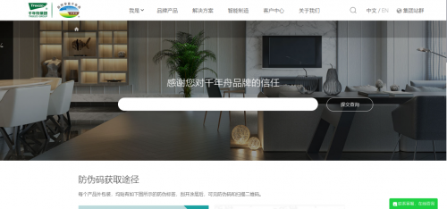 電腦登錄千年舟官網www.treezogroup.com,選擇右側“防偽查詢”,進入防偽碼查詢頁面,輸入防偽碼進行真偽查詢。