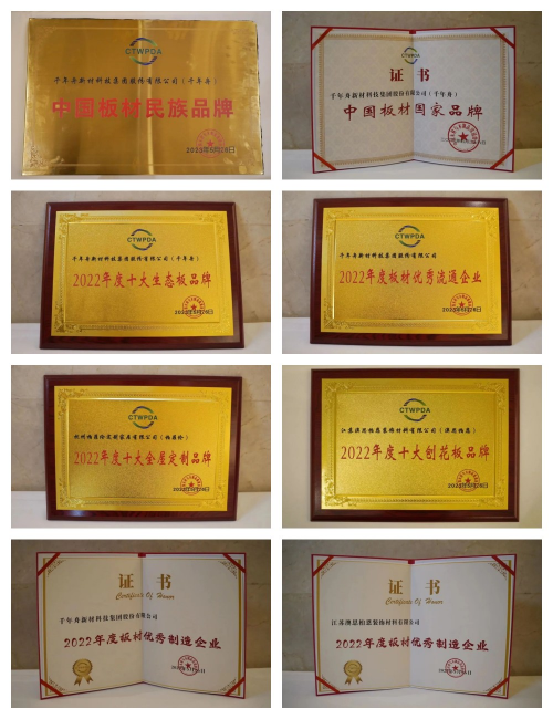 千年舟榮獲“中國板材國家品牌”、“中國板材民族品牌”、“2022年度十大生態板品牌”、“2022年度板材優秀流通企業”、“2022年度板材優秀制造企業”,千年舟集團旗下柏菲倫獲2022年度十大全屋定制品牌”,千年舟集團旗下澳思柏恩獲2022年度十大刨花板品牌”、“2022年度板材優秀制造企業”。