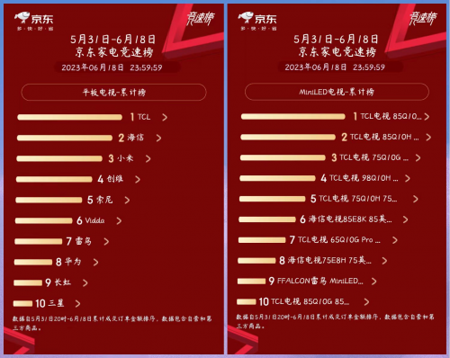 在618購物節期間,TCL全網全品類GMV突破40億,同比增長39%,其中TCL電視全網銷售額冠軍;Mini LED電視全網銷售額&銷售量、雙冠軍;量子點電視全網銷售額&銷售量雙冠軍;75時+超大板電視全網銷售額&銷售量雙冠軍;98時巨幕電視全網銷售額&銷售量雙冠軍。